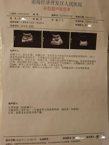 2024年我们回国过暑假。我儿子又突然肚子痛了,我妈妈建议把小孩子看中医。老中医一按我儿子肚子,小孩子痛得瓜瓜大叫,中医建议要照B超。结果出来后把医生都吓坏了,诊断是左肾重度积水,医生还说她真的没见过这么小的孩子有那么厉害的积水,还责怪我们做家长的太大意了!当时我儿子的左边的肚子鼓了起来!这时候把我们吓坏了,我妈妈建议我们下午吃完饭就马上转去大医院。一番周折之后,大医院医生建议马上做手术把积水排除了。但是我们还有一个星期就要回丹麦了,我们究竟要怎么办呢?如果我们等到回丹麦,丹麦医疗制度这么慢,不知道又要等到牛年马月才能排上做手术呢?!已经是重度积水了,拖了那么久不能再拖了!但是如果我们留在中国做手术,飞机要取消了然后还要请假不能上班,最难搞的是,这手术一做还不知道什么能康复出院呢,那我们不能回丹麦也非常麻烦啊。